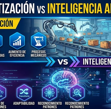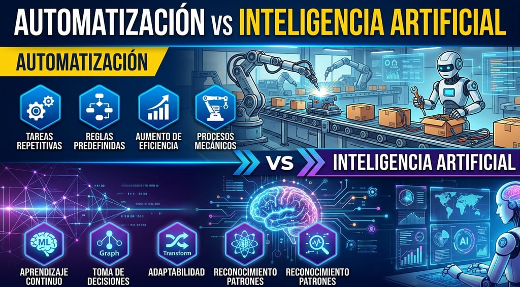 ¿Confundes automatización con IA? Descubre la diferencia técnica y estratégica para tu empresa. Optimiza procesos y escala 🚀